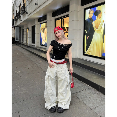 Unisex卡其寬管褲|拼接線條+抽皺設計|顯瘦百搭|個性街頭風